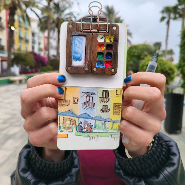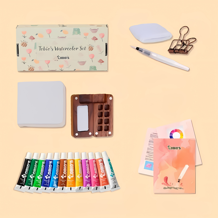 W zestawie znajdziesz 12 żywych, kremowych pigmentów, które pozwalają tworzyć nieskończoną liczbę kolorów, wytrzymały szkicownik z papieru bawełnianego, doskonale chłonący farbę, oraz innowacyjny pędzel wodny, który sprawia, że możesz malować zawsze i wszędzie.